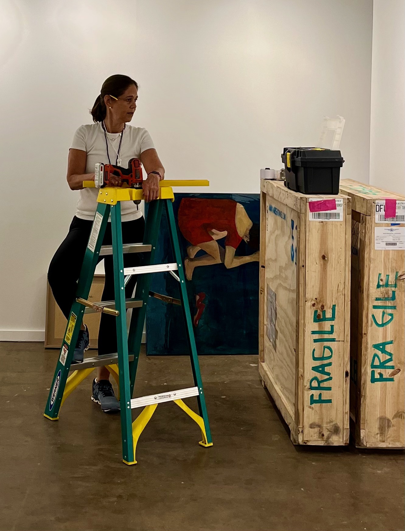 In my job, I wear many hats. I've always said, "I am the director of numerous departments in my gallery. Installation and hanging artworks is one of them. Here I am ready to put together my booth at the Dallas Art Fair.